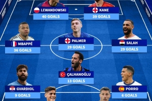 中场:恰尔汗奥卢(13球)、姆巴佩(36球)、帕尔默(29球)、萨拉赫(29球)
