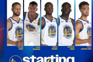 赛前,勇士官推公布了本场首发:库里、施罗德、维金斯、追梦、TJD。