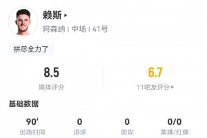 体育资讯1月8日讯 英联杯半决赛首回合,阿森纳主场0-2纽卡斯尔。此役赖斯首发打满全场多项数据位列全场最多,球员全场重点数据如下↓