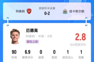 厄德高本场比赛首发踢满全场,表现糟糕,被吧友打出2.8分的全队最低分!