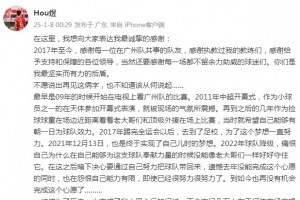 体育资讯1月8日讯 广州队退出职业联赛后,队中多名球员陆续向球队发出告别。队长侯煜在今天凌晨更新微博,回忆起曾在广州队的点点滴滴,并再一次喊出“为广州而战”。