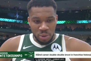 据统计,这是字母哥第432次两双,超越天勾贾巴尔,排在雄鹿队史第一。