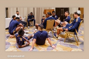 体育资讯1月9日讯 北京时间明天凌晨3:00,皇马将在西超杯半决赛中对阵马洛卡,这场比赛在沙特吉达举行。赛前,本泽马到了皇马下榻的酒店,与安切洛蒂以及球员们寒暄。