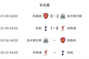 体育资讯01月09日讯 英格兰联赛杯半决赛首回合战罢,利物浦0-1热刺,阿森纳0-2纽卡,英超前2均在首回合失利。
