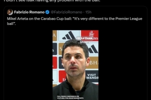 阿尔特塔:联赛杯用球和英超的非常不同,飞行方式不一样要适应